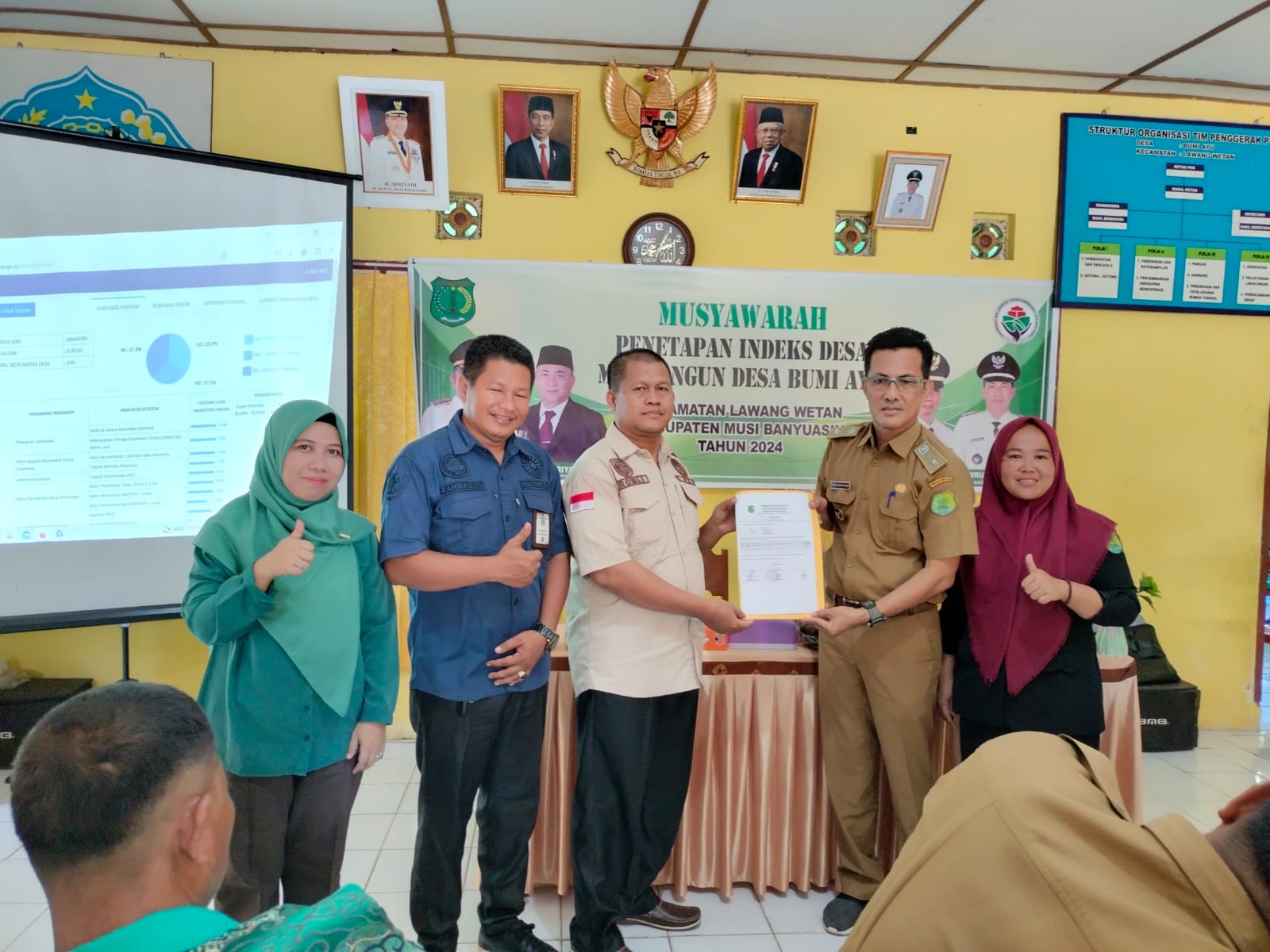 Muba,lensarakyat.net – Berdasarkan Hasil Musyawarah Penetapan Indeks Desa tahun 2024 Di Kantor Desa Bumi ayu,Rabu(05/06/2024).Desa Bumi ayu Kecamatan Lawang wetan Kabupaten Musi Banyuasin di tahun 2024 ini mendapatkan predikat sebagai Desa mandiri.