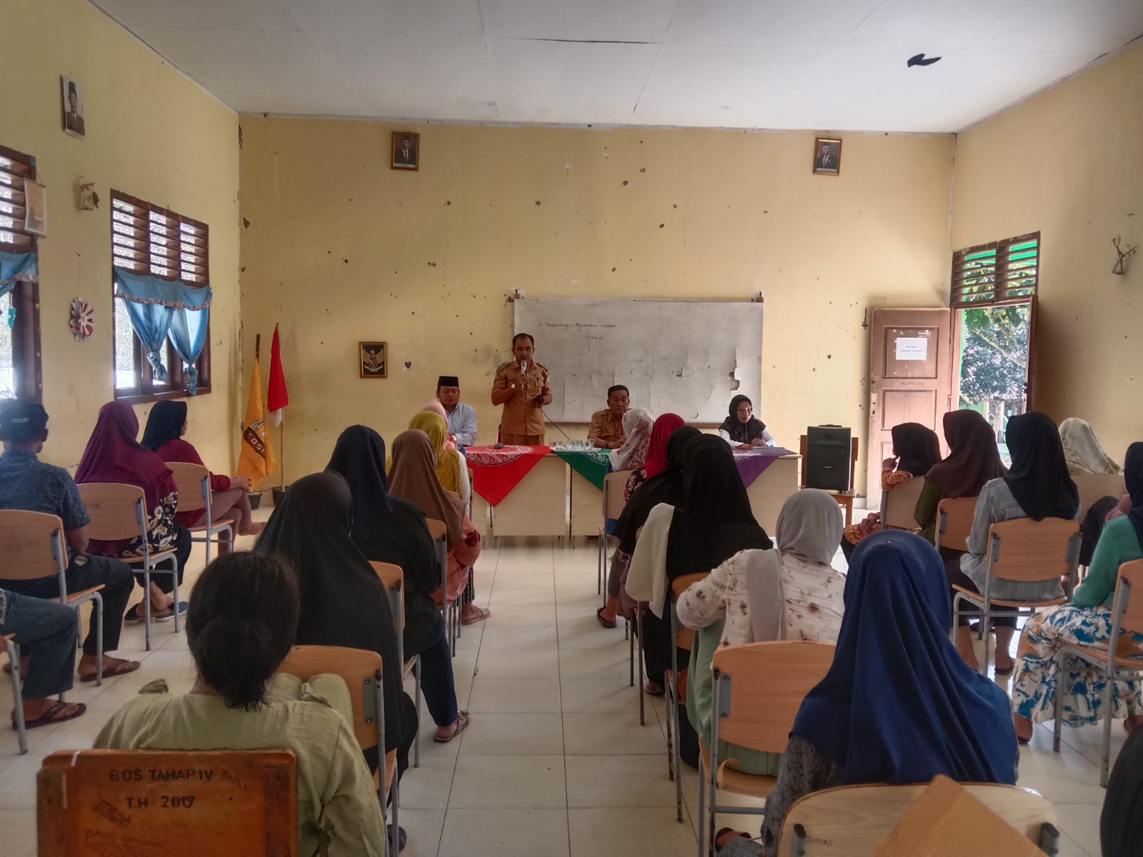 Sejumlah orang tua/wali berkumpul disalah satu kelas dan mendengarkan dengan baik himbauan dan arahan yang disampaikan Kepala Desa Sindang marga Ali Sapran didampingi perangkat desa.
