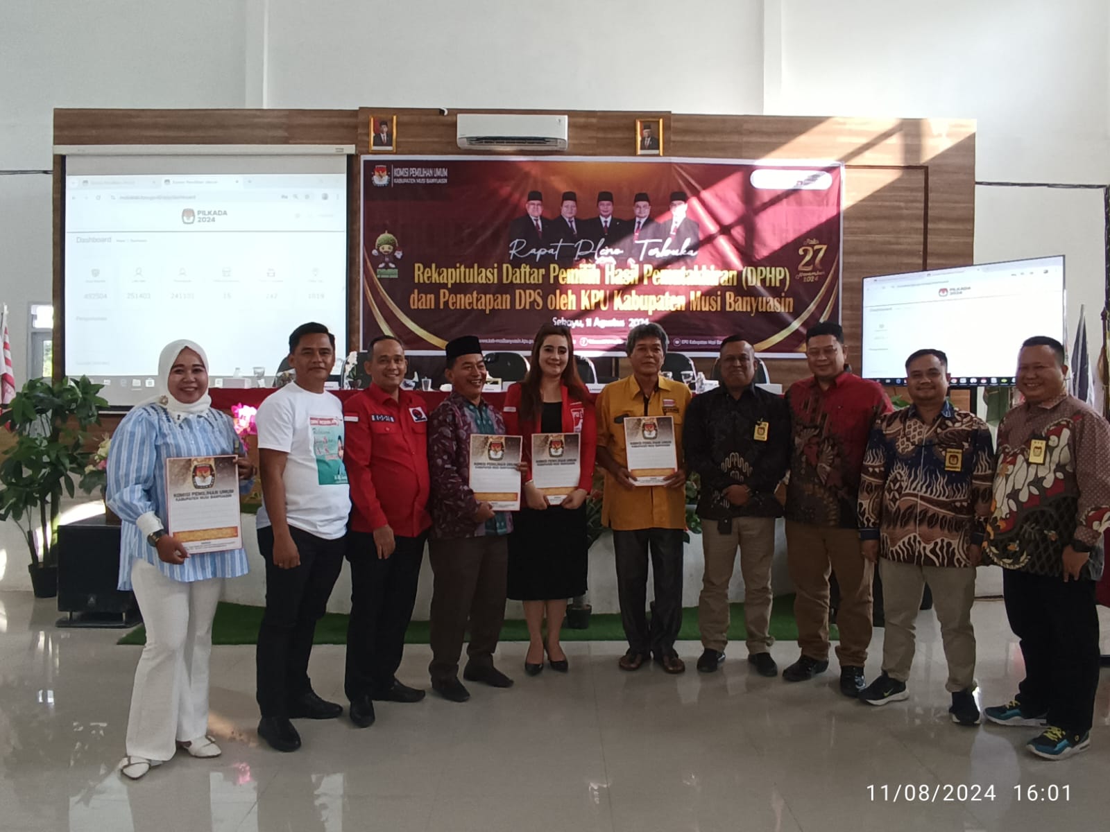 Hasil Rapat Pleno tersebut Daftar Pemilih Sementara (DPS) Kabupaten Musi Banyuasin untuk pemilihan serentak tahun 2024 yang tercatat berjumlah 492.504 pemilih. Dengan rincian pemilih laki-laki sebanyak 251.403 pemilih dan Perempuan 241.101 pemilih yang tersebar di 15 kecamatan dan 242 Desa/Kelurahan. Hasil ini berdasarkan rapat pleno nomor 228/PL.01.2-BA/1606/2024 dan Keputusan KPU Kabupaten Musi Banyuasin Nomor 67 tahun 2024.
