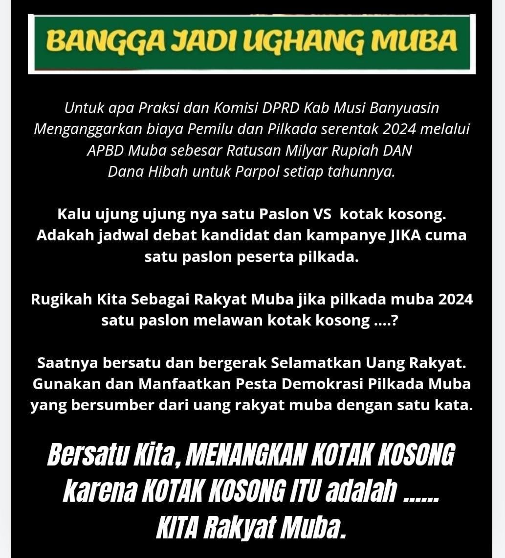 “Menurut saya, jika nantinya benar pilkada muba 2024 hanya diisi satu paslon melawan kotak kosong, sia-sia saja uang rakyat yang terbuang untuk itu mari kita selamatkan uang rakyat dengan memenangkan kotak kosong karena didalam kotak kosong tersebut adalah suara rakyat,” katanya.