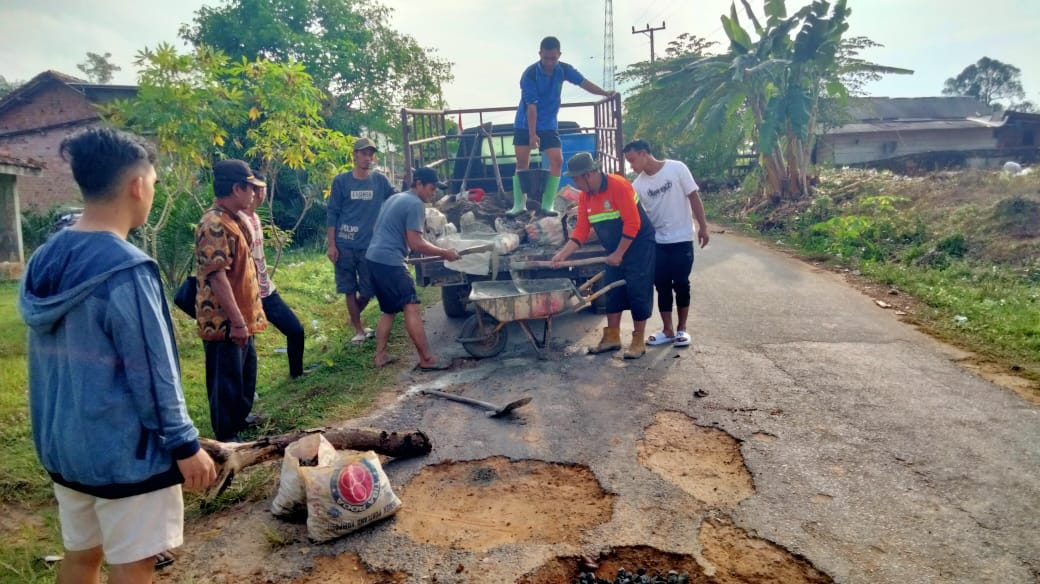 Terlihat jelas warga desa berjibaku membawa bahan material yang digunakan untuk melakukan penampalan terhadap beberapa ruas jalan yang berlubang.