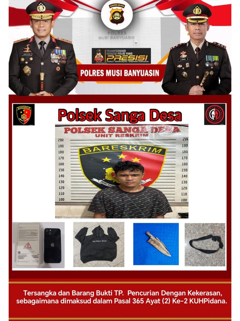 SANGA DESA,Lensarakyat.net – Kasus pencurian dengan kekerasan yang terjadi di wilayah hukum Polsek Sanga Desa akhirnya berhasil diungkap. Salah satu pelaku, Agus Saputra Bin Zulkarnain (26), warga Dusun VI Desa Tanjung Raya Kecamatan Sanga Desa Kabupaten Musi Banyuasin (Muba), menyerahkan diri ke pihak kepolisian setelah sebelumnya menjadi buronan atas kasus perampokan terhadap sopir truk di jalan poros PT Wanapotensi Guna (WPG) Desa Penggage.