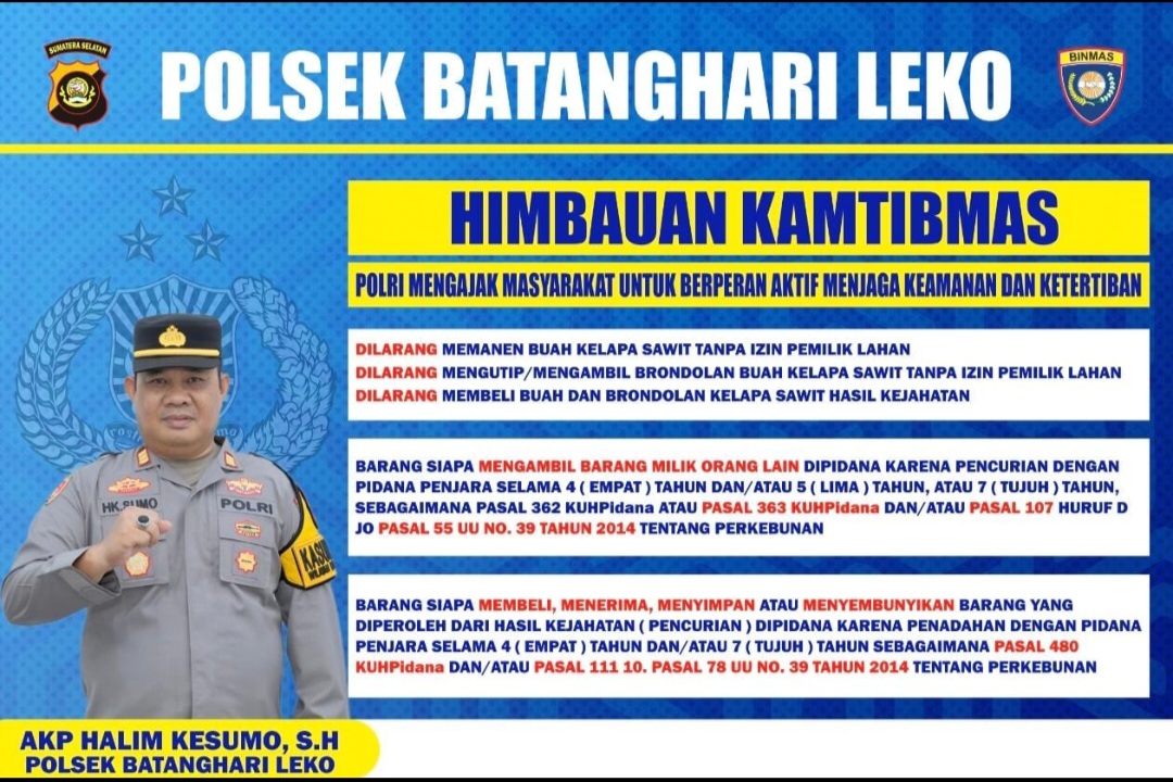 AKP Halim menghimbau agar masyarakat segera melaporkan apabila terjadi kasus Pencurian Kelapa Sawit terjadi diwilayah Kecamatan Batanghari Leko khususnya.