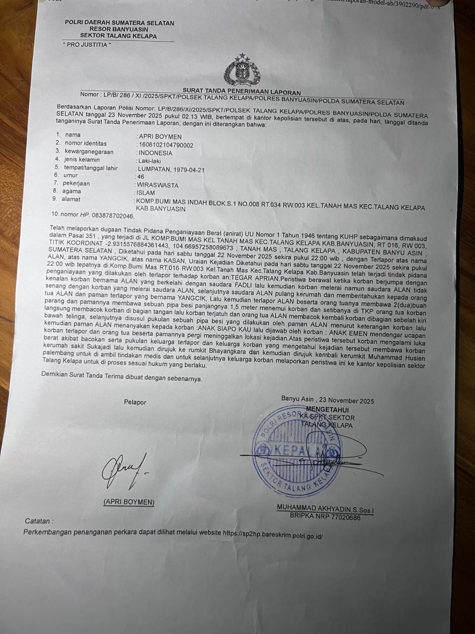 Hal ini diungkapkan oleh AP yaitu orangtua korban, minggu (07/12/2025).pihaknya menyayangkan dan merasa kecewa atas sikap aparat yang terkesan membiarkan pelaku yaitu Alan, Yangcik dan Kasan yang masih berkeliaran tanpa tindak tegas.