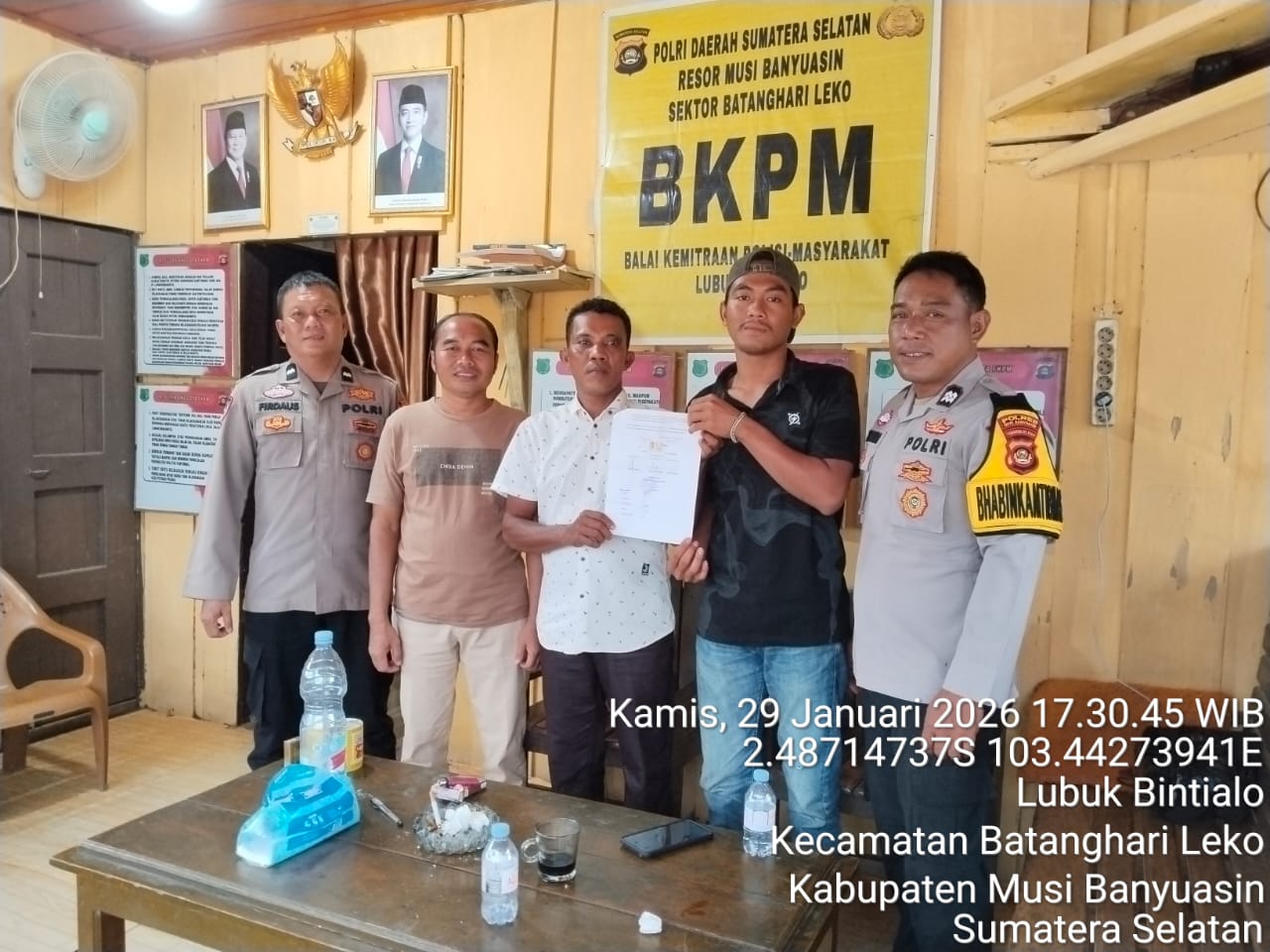 MUBA,Lensarakyat.net -Personel Kepolisian Sektor (Polsek) Batang Hari Leko bersama Binmas Polres Musi Banyuasin (Muba) memfasilitasi penyelesaian permasalahan warga melalui kegiatan problem solving atau pemecahan masalah yang berlangsung di BKPM Desa Lubuk Bintialo, Kecamatan Batang Hari Leko, Kabupaten Musi Banyuasin, Kamis (29/1/2026) sore.
