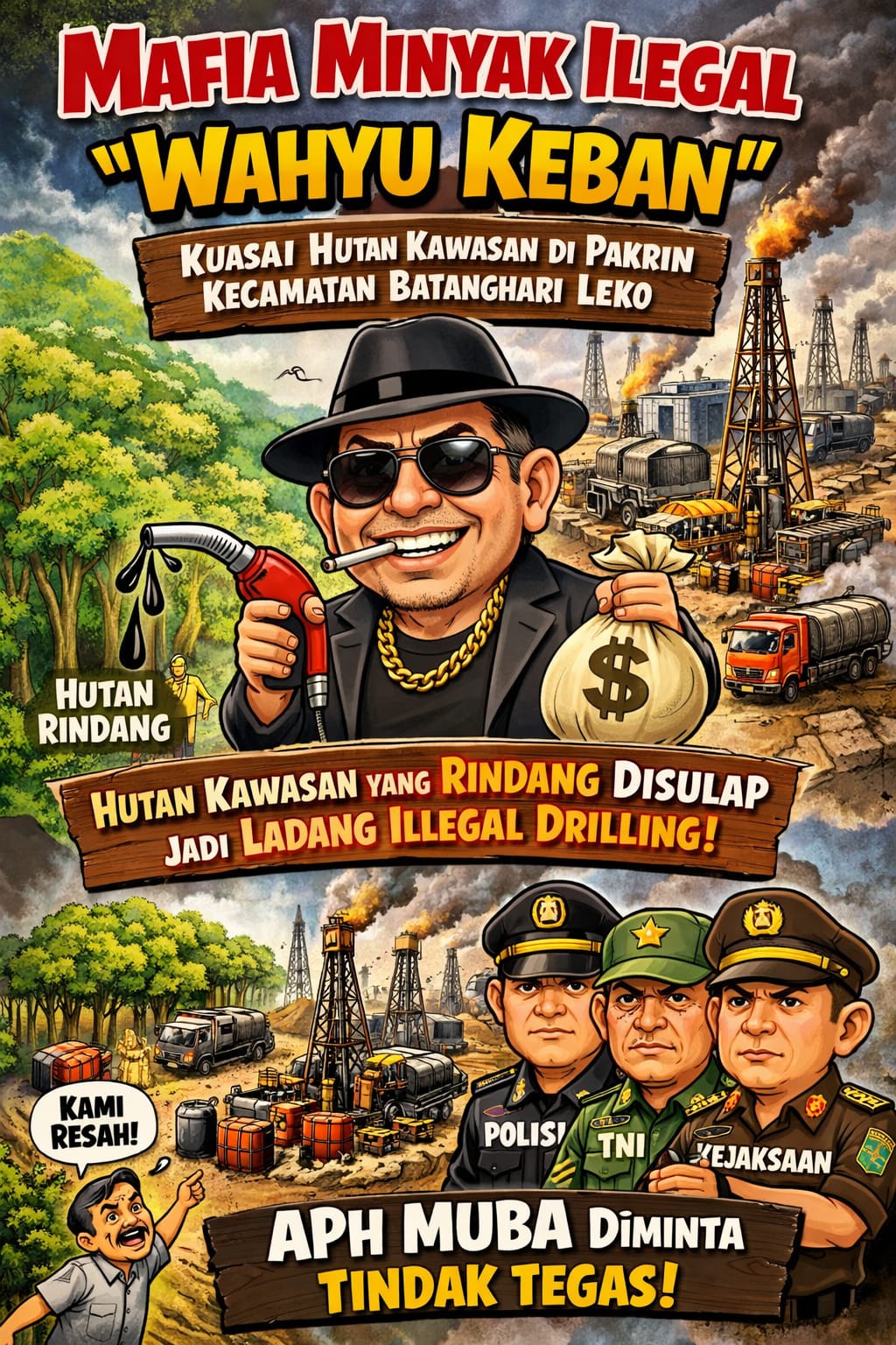 Berdasarkan informasi narasumber yang enggan disebutkan identitas menyampaikan ke PJS Muba, sosok “Wahyu” mafia minyak Ilegal tersebut menguasai Puluhan Hektar Hutan Kawasan di Kecamatan Batang Hari Leko dan dijadikan pengeboran minyak Ilegal.